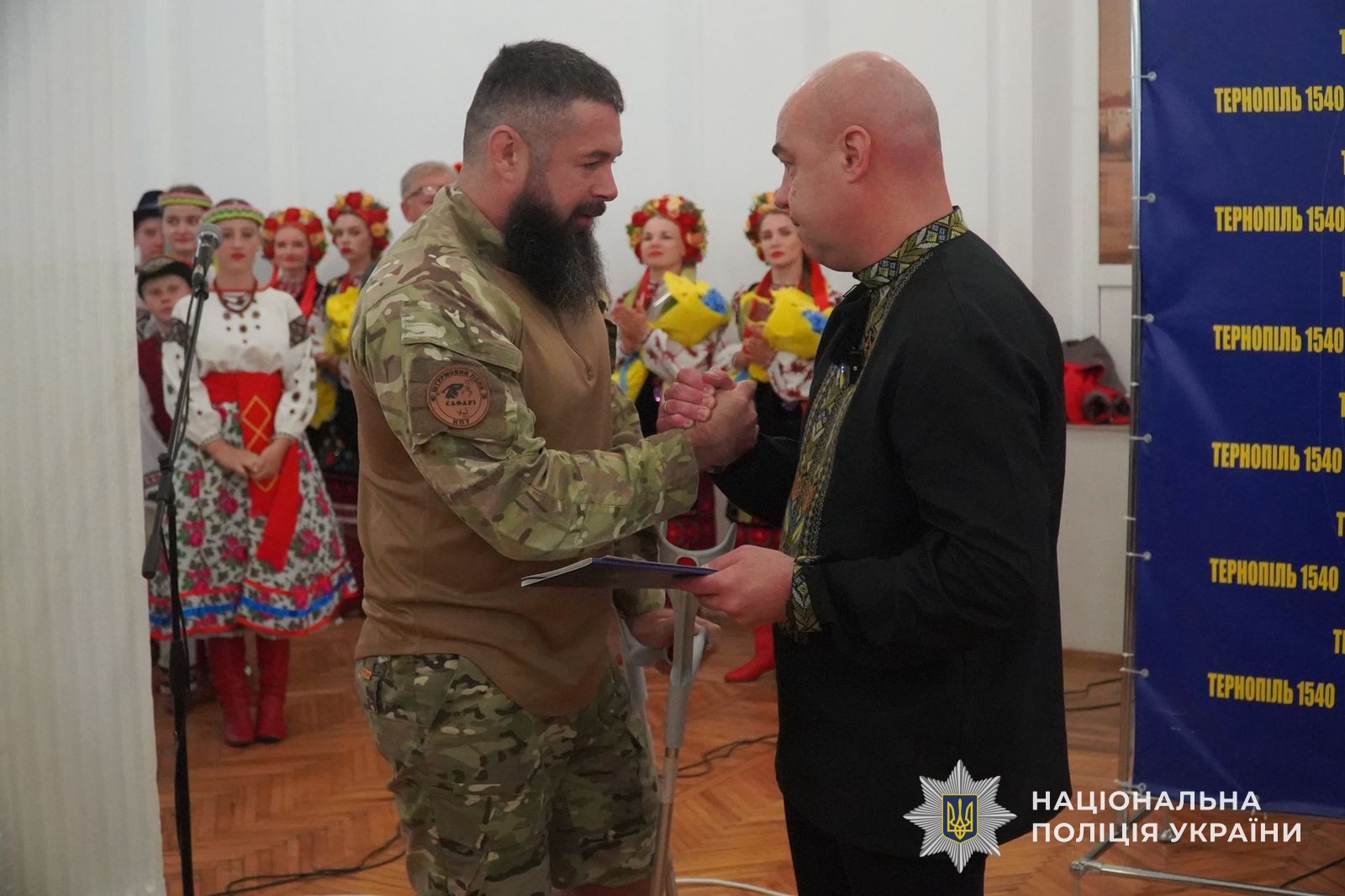 Сертифікат на житло від Тернопільської міської ради вручили бійцю об’єднаної штурмової бригади Національної поліції «Лють» Миколі Гринчуку. Натомість він передав міському голові Сергію Надалу шеврон свого бойового підрозділу, бійці якого щодня мужньо виконують завдання із захисту незалежності, суверенітету та територіальної цілісності України на найгарячіших напрямках фронту.