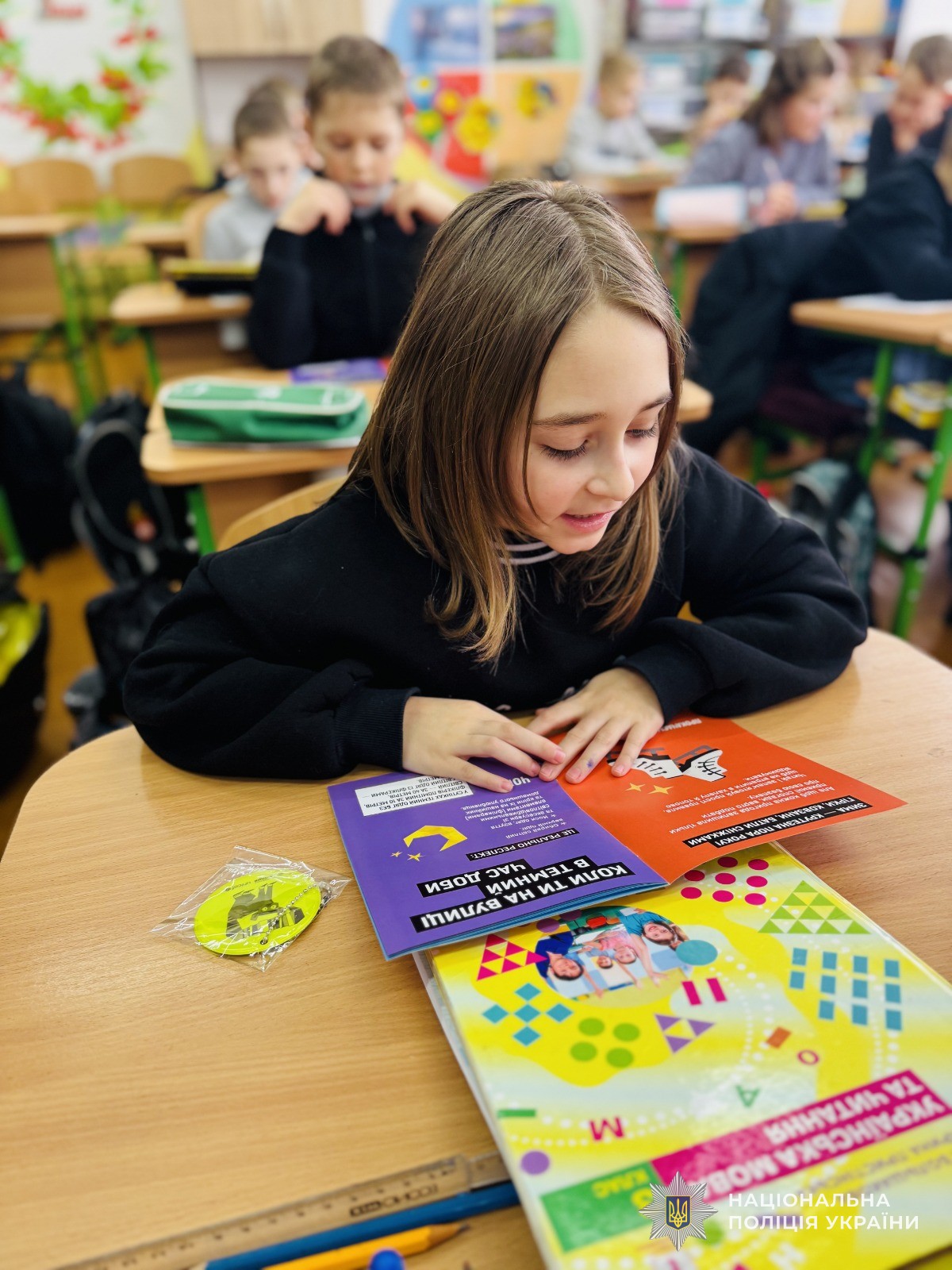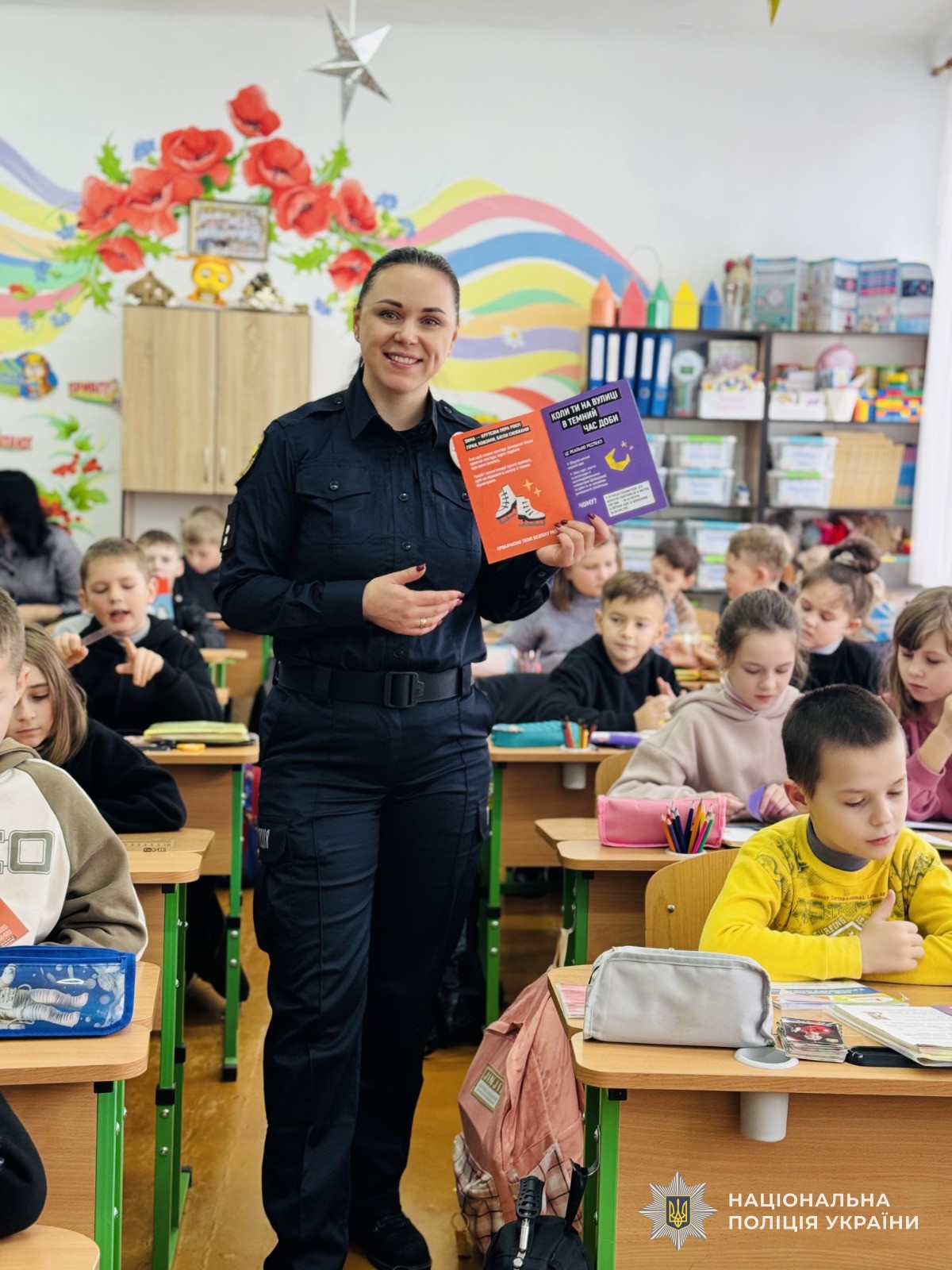 Діти разом із поліцейською повторили основні правила дорожнього руху та в ігровій формі моделювали різні ситуації, які можуть виникати на дорозі, обговорюючи правильні дії для уникнення небезпеки. Школярі активно відповідали на запитання щодо безпечної поведінки на вулицях міста, а також правил переходу проїжджої частини на регульованих і нерегульованих пішохідних переходах.