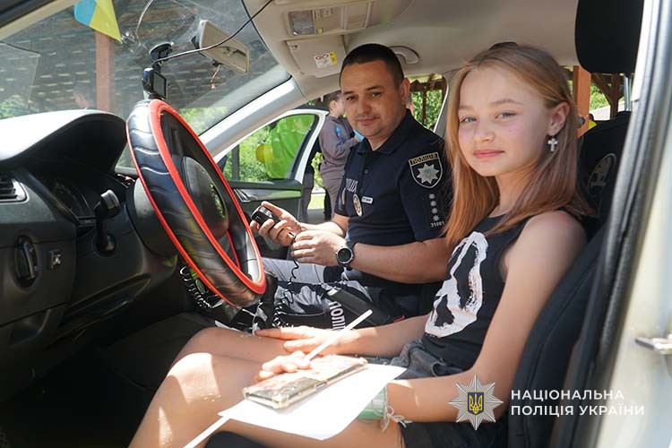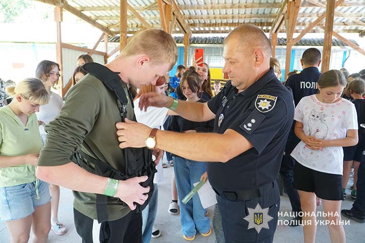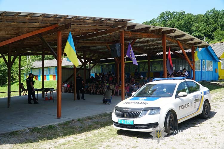 Юні відпочивальники приміряли спорядження поліцейських, дослідили салон службового автомобіля, отримали сувеніри, а головне – пригадали правила безпеки та почули відповіді на свої запитання.