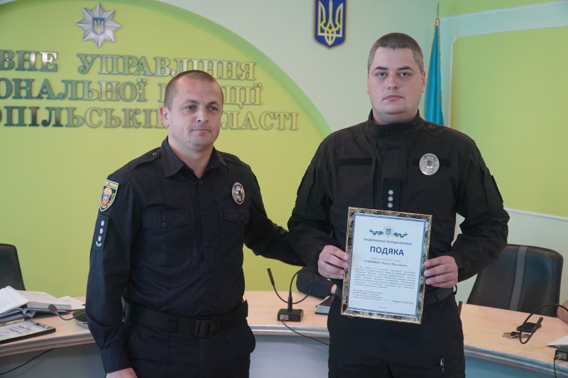 Подяки від заступника голови Національної поліції Максима Цуцкірідзе отримали працівники слідчого підрозділу. Відомчі відзнаки підлеглим вручив т.в.о. начальника Головного управління Нацполіції в Тернопільській області Володимир Галевич.