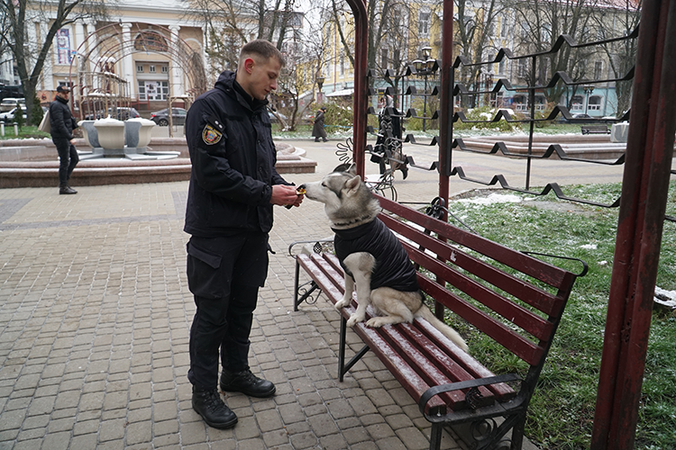 "Зараз воєнний стан, збільшилася кількість нарядів та патрулів. Часу погуляти ввечері фактично немає, а тому я беру його із собою в патруль. Ввечері темно, а собака роботі не заважає, а навпаки - допомагає".