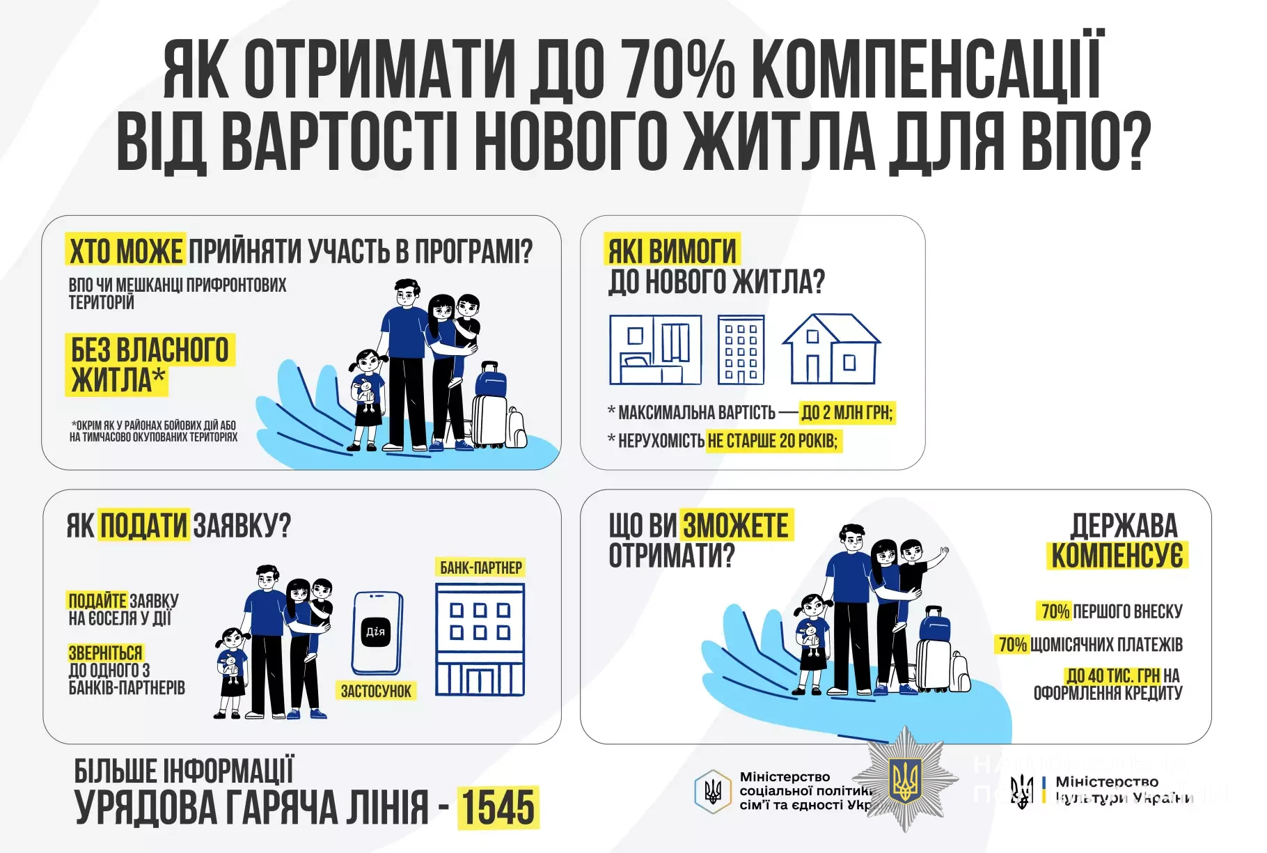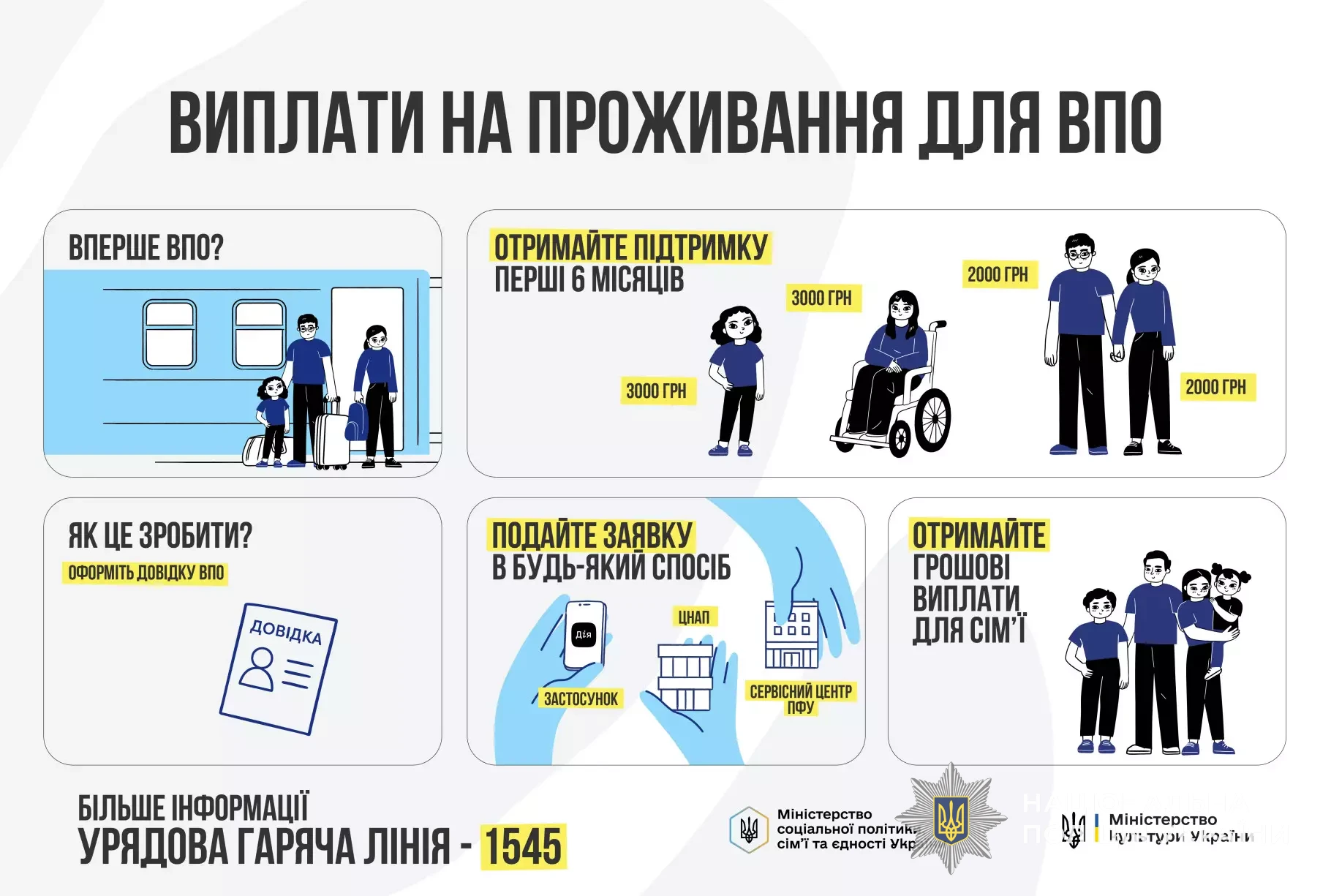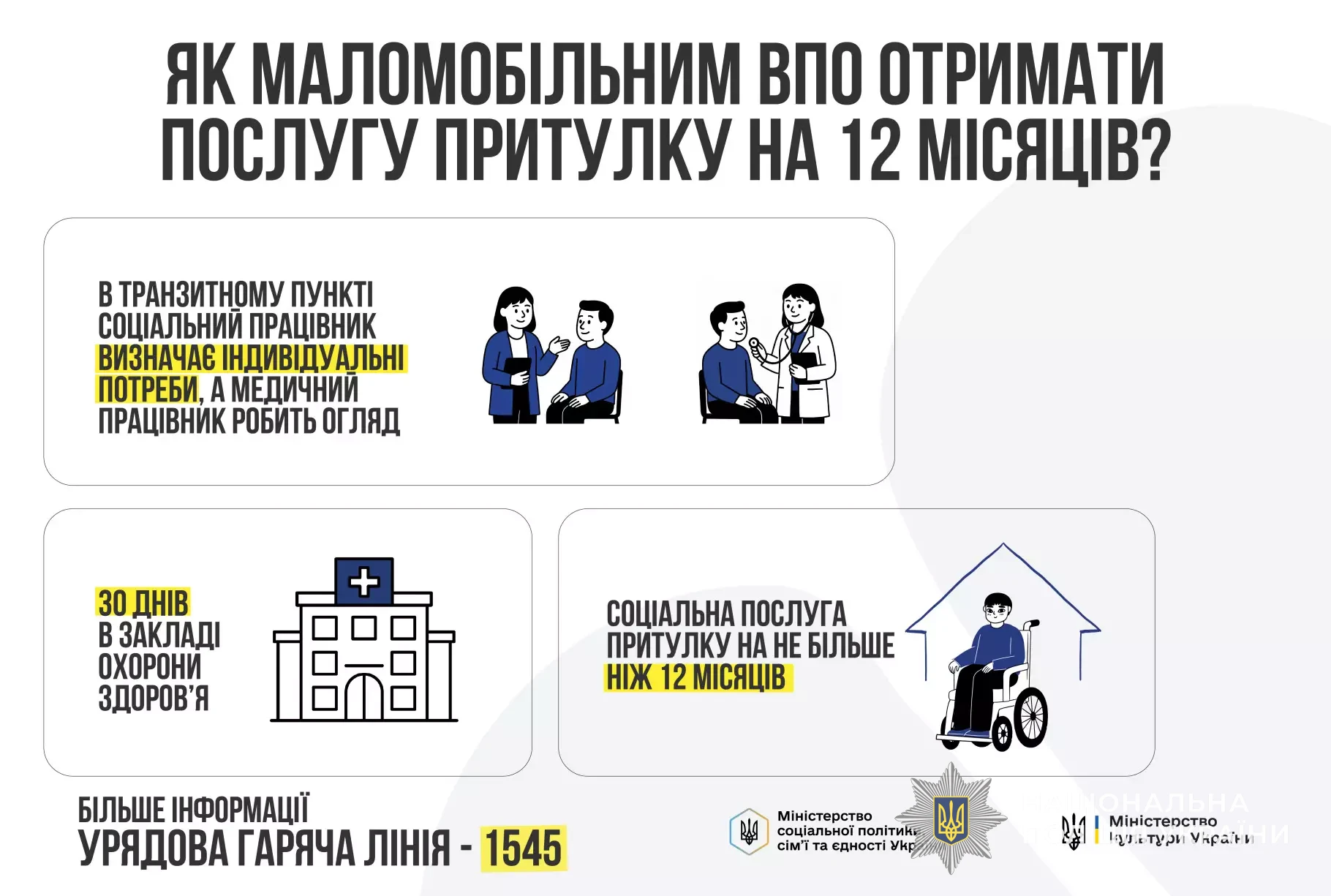 Міністерство культури України у співпраці з Міністерством соціальної політики, сім’ї та єдності України за результатами проведення мистецького конкурсу забезпечують проведення інформаційної кампанії щодо доступності соціальних послуг для внутрішньо переміщених осіб.