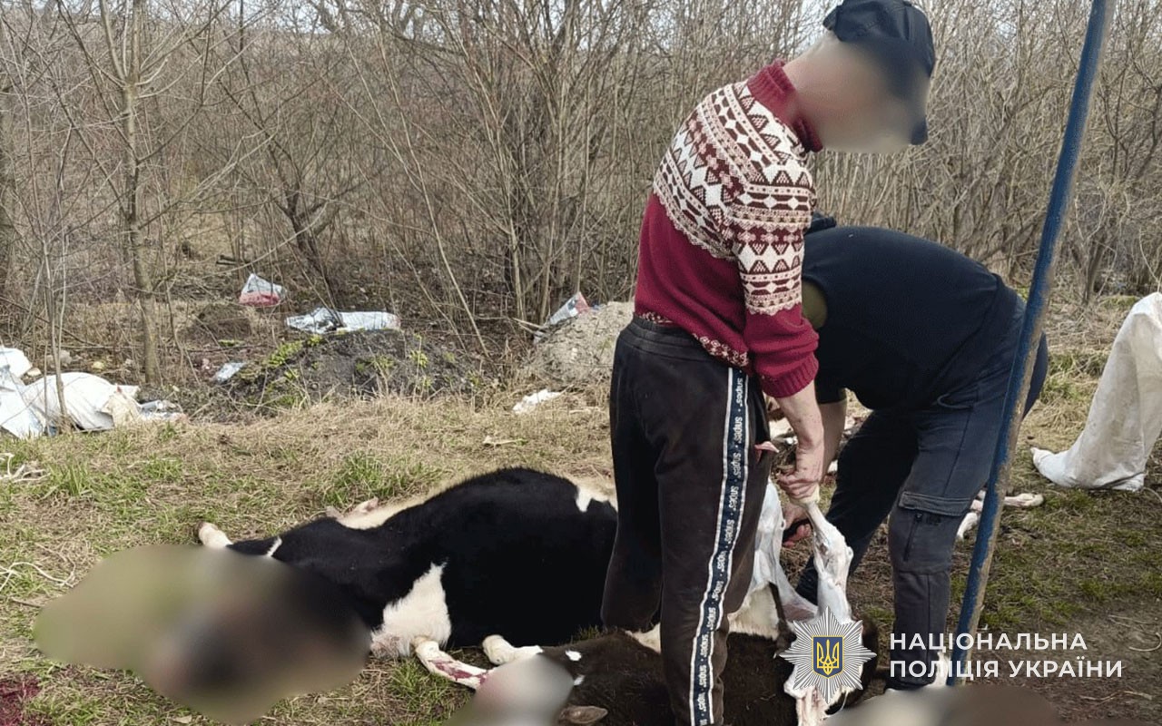 На місці події поліцейські спільно з фахівцями Держпродспоживслужби виявили двох чоловіків, які обвалювали туші телят поблизу сміттєзвалища. Встановлено, що супровідних документів та інформації про походження тварин у них не було.