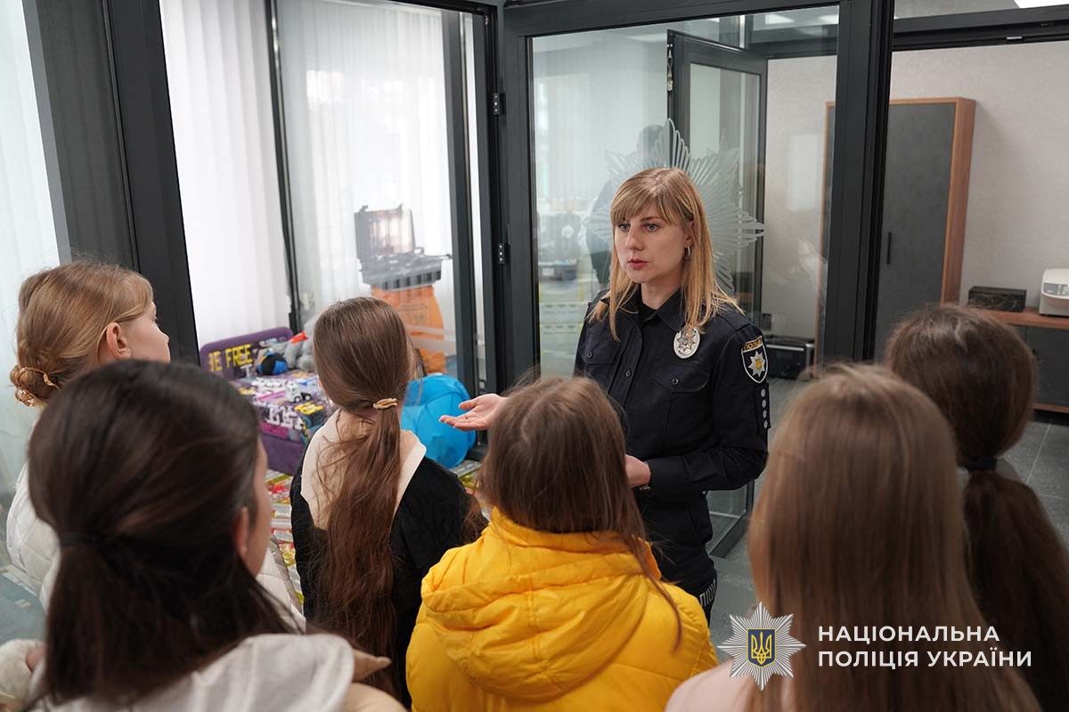 «Насамперед ми показали школярам «зелену кімнату» - спеціально облаштований простір, дружній до дитини. Тут ювенальні поліцейські працюють з неповнолітніми, які постраждали або стали свідками злочинів. Атмосфера має бути безпечною та комфортною, щоб дитина могла вільно говорити», - розповіла старший інспектор відділу ювенальної превенції Галина Купровська.