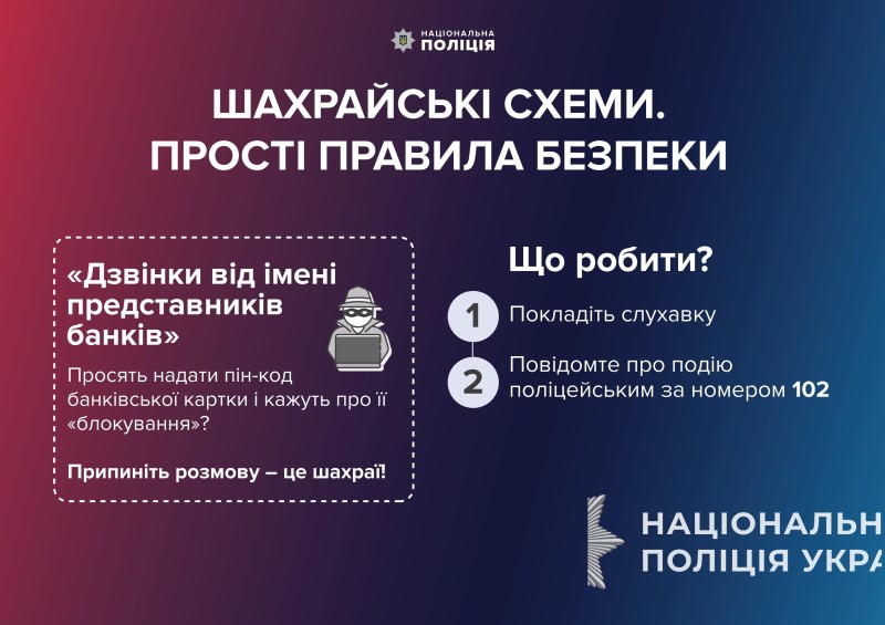 Працівники банку ніколи не перевіряють ваші персональні дані. Окрім цього не потрібно розголошувати коди, які приходять вам на мобільний номер, і не набирайте на вашому телефоні невідомі вам комбінації цифр.