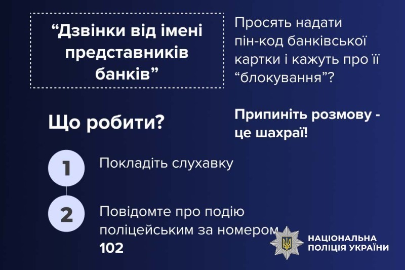 Поліцейські застергіають: не виконуйте жодних фінансових операцій за вказівками незнайомців по телефону або через месенджери, не повідомляйте стороннім особам реквізити картки, паролі чи коди з SMS.