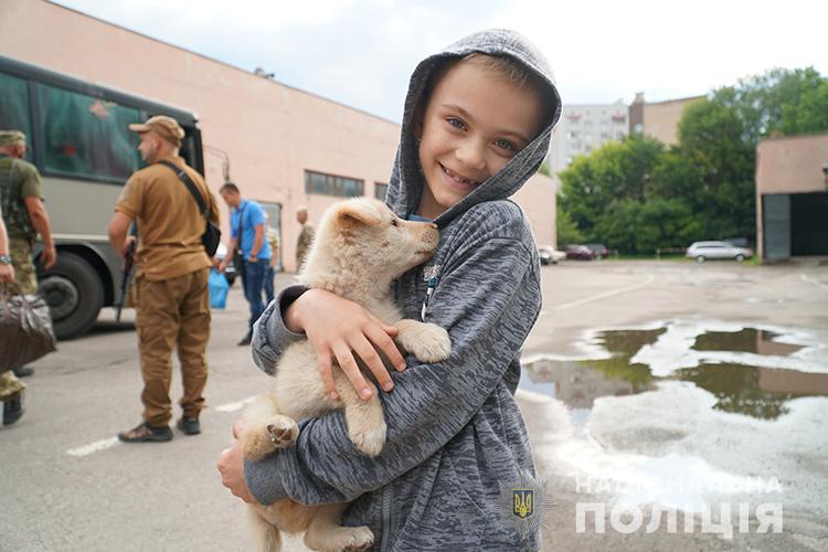 Хлопчику поліцейські привезли зі сходу омріяного друга - собаку. Оголошення про пошук господарів для цуценят, котрі народилися на східних рубежах, побачила у соцмережі мама хлопчика. Жінка одразу зголосилася забрати одне цуценя для сина. Працівники зведеного загону допомогли їй здійснити задумане.