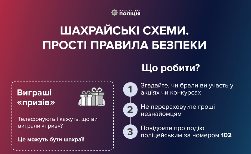 Поліцейські вкотре радять жителям області не довіряти телефонним незнайомцям та не розголошувати їм свої особисті дані та дані банківської картки. Виграти можна лише там, де ви самі берете участь! Несподіваний виграш, про який ви вперше чуєте, – це завжди шахрайська пастка.