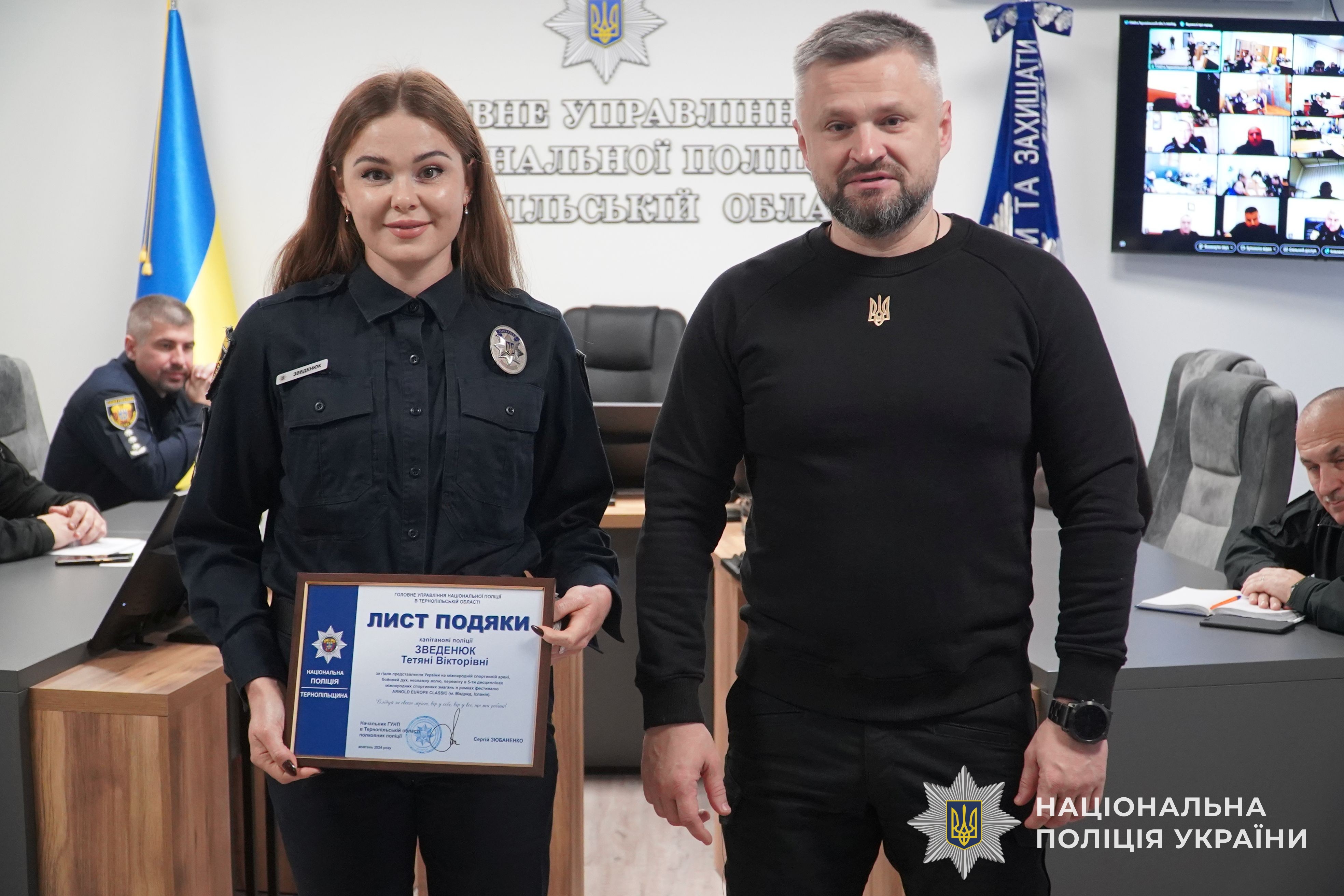 За гідне представлення України на міжнародній спортивній арені начальник ГУНП в Тернопільській області Сергій Зюбаненко вручив Тетяні подяку та цінний подарунок.