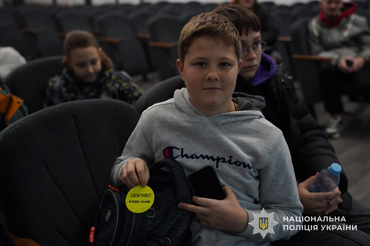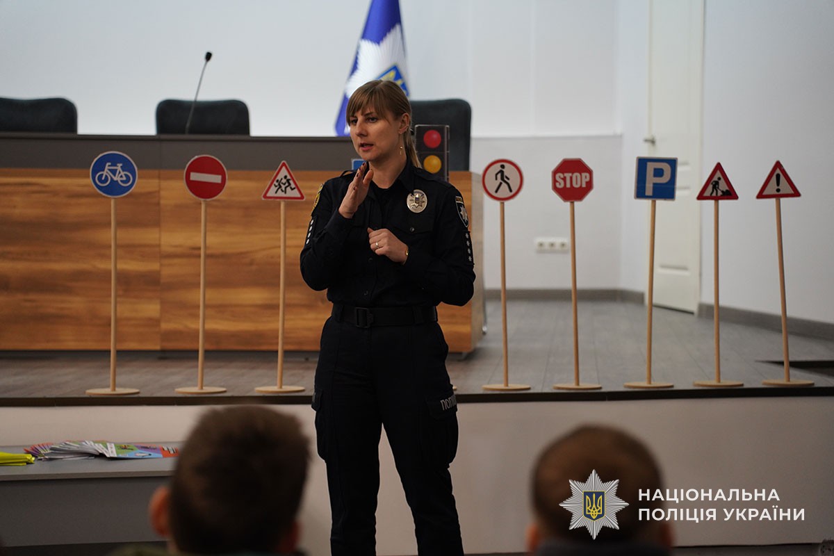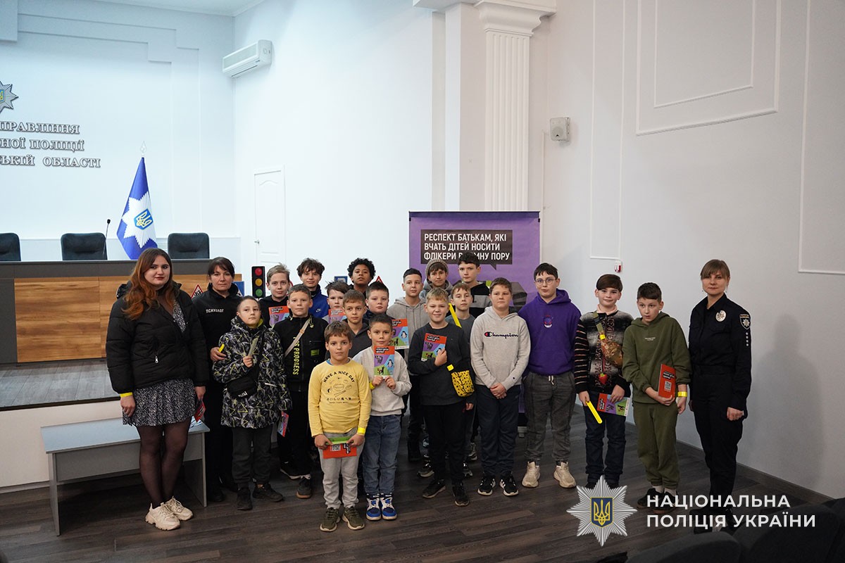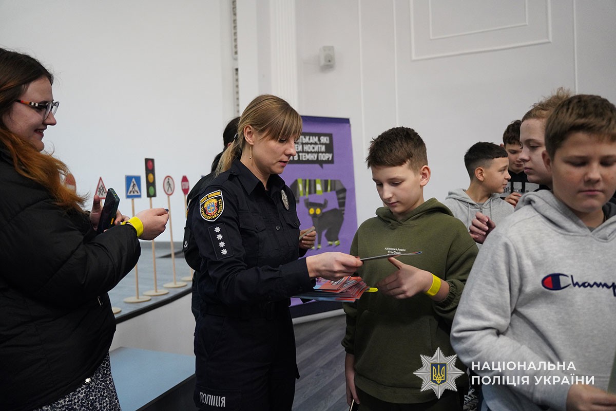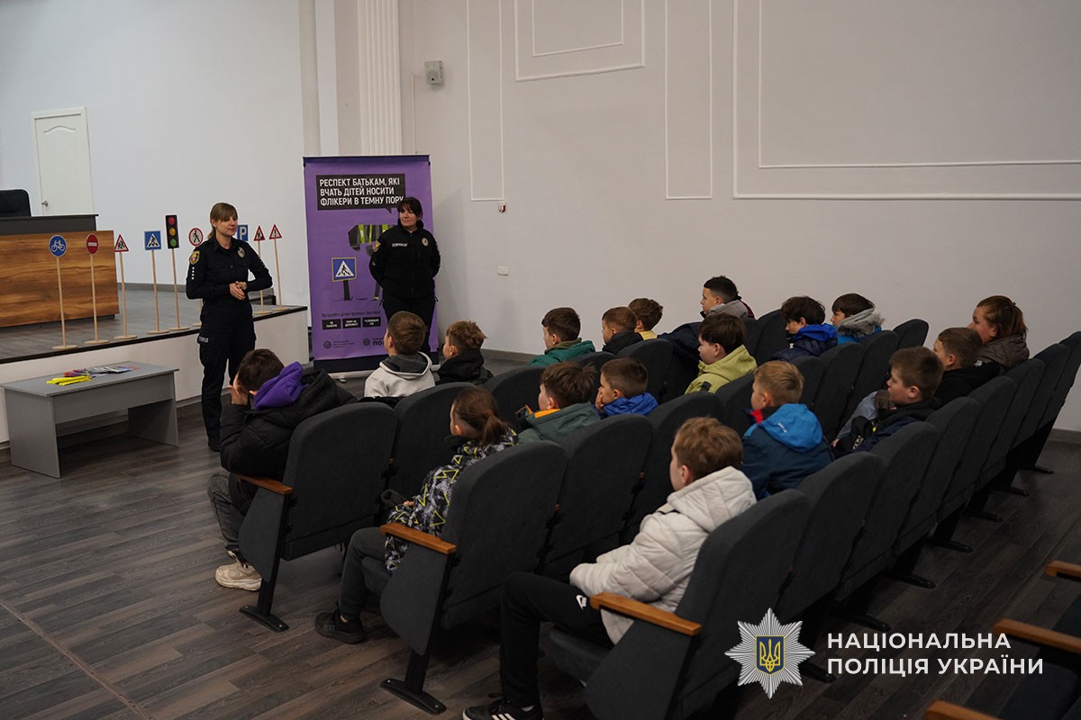 Ювенальні поліцейські організували для дітей інтерактивне заняття: розповіли про значення основних дорожніх знаків, сигналів світлофора і регулювальника, а також навчали бути уважними на дорозі. Вони наголосили на важливості використання світлоповертаючих елементів у темну пору доби, щоб залишатися помітними для водіїв. Школярам також роздали флікери, які зручно кріпити на одяг або наплічник.