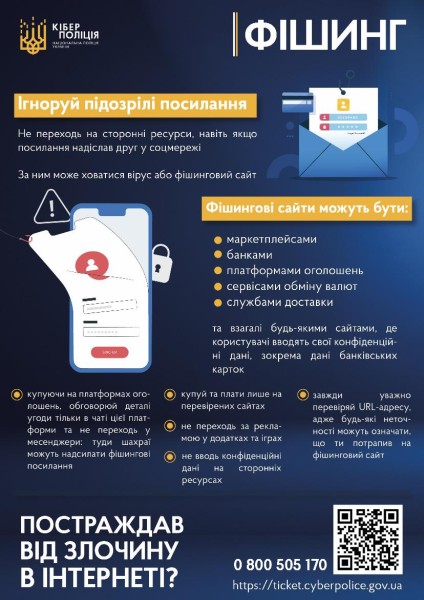 Детальні поради від кіберполіції дивіться тут.( https://cyberpolice.gov.ua/news/yak-ne-staty-zhertvamy-shaxrajstva-z-vykorystannyam-fishyngu---rekomendacziyi-kiberpolicziyi-8382/)