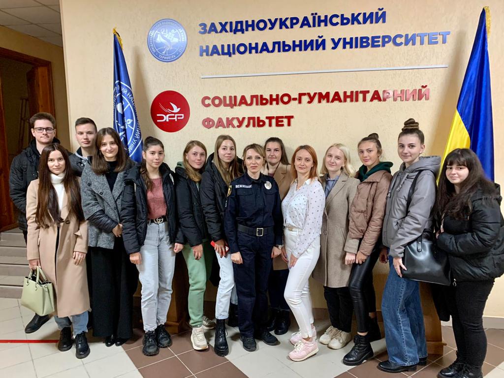 Зустріч представниць викладацького складу та студенток з підполковником поліції, старшим психологом з ОД сектору психологічного забезпечення УКЗ ГУНП в Тернопільській області Аллою Круть відбулася на базі соціально-гуманітарного факультету Західного Українського Національного університету. Тема зібрання - гендерна політика в силових структурах та надання психологічної підтримки.