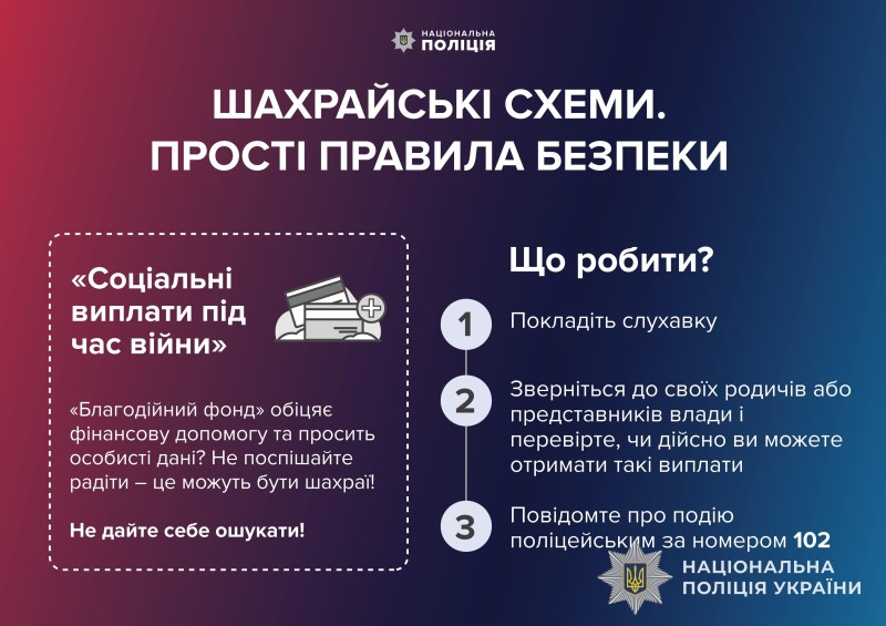 Якщо ви постраждали від шахраїв, не зволікайте та телефонуйте на спецлінію «102». Для оперативного надання допомоги від працівників Департаменту кіберполіції Національної поліції України звертайтесь за номером 0 (800)50-51-70.