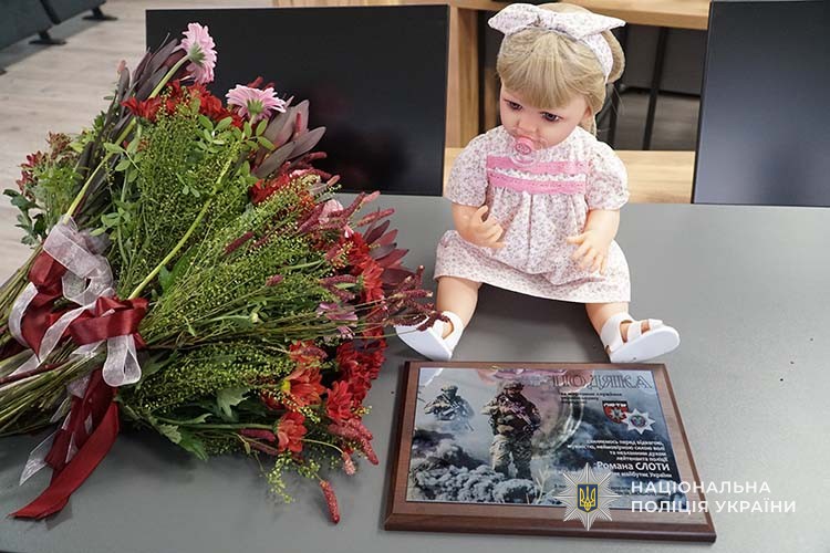 Ще одну ляльку працівники поліції подарували 3-річній Софійці - доньці загиблого бійця об’єднаної штурмової бригади «Лють» Романа Слоти з Чортківщини. Під час виконання бойового завдання поліцейський віддав своє життя за свободу і мир українців.
