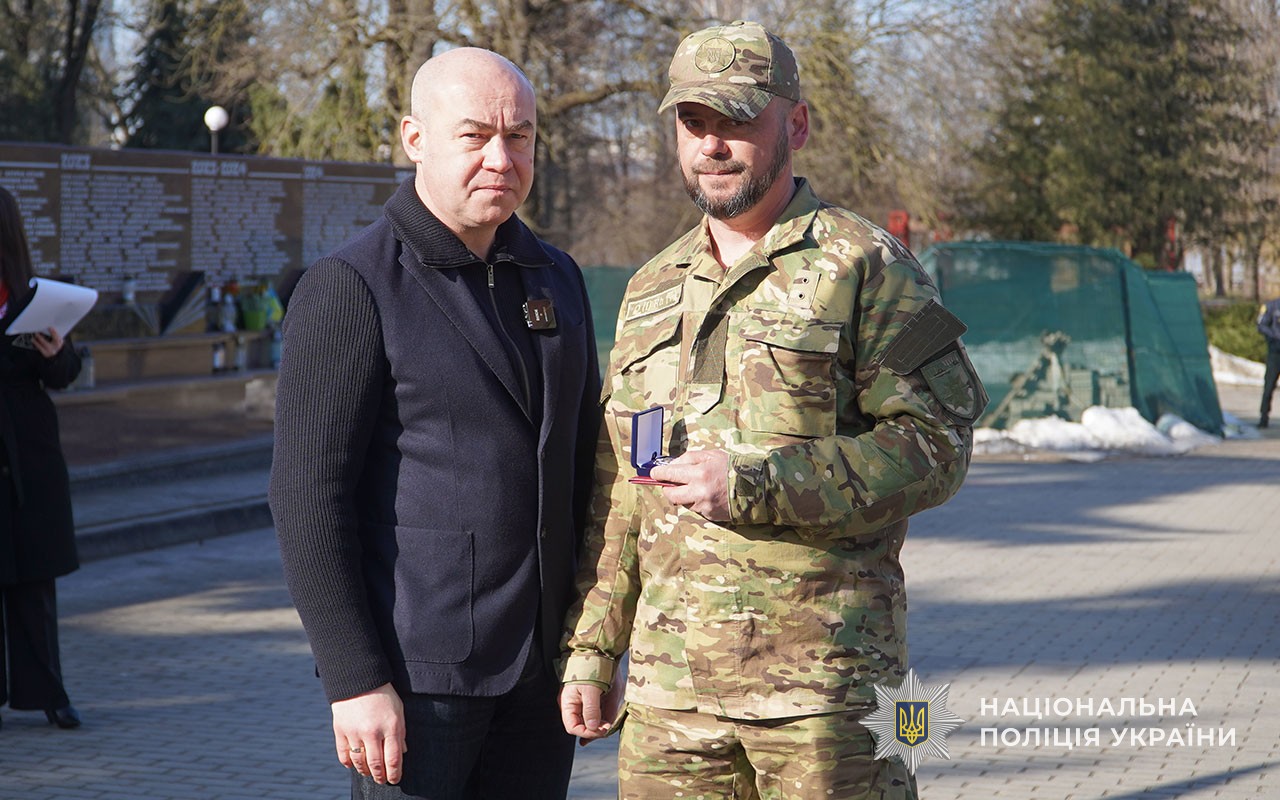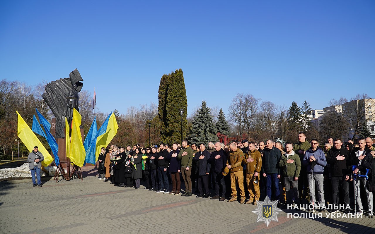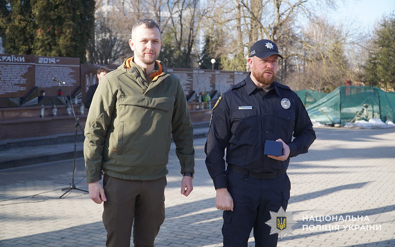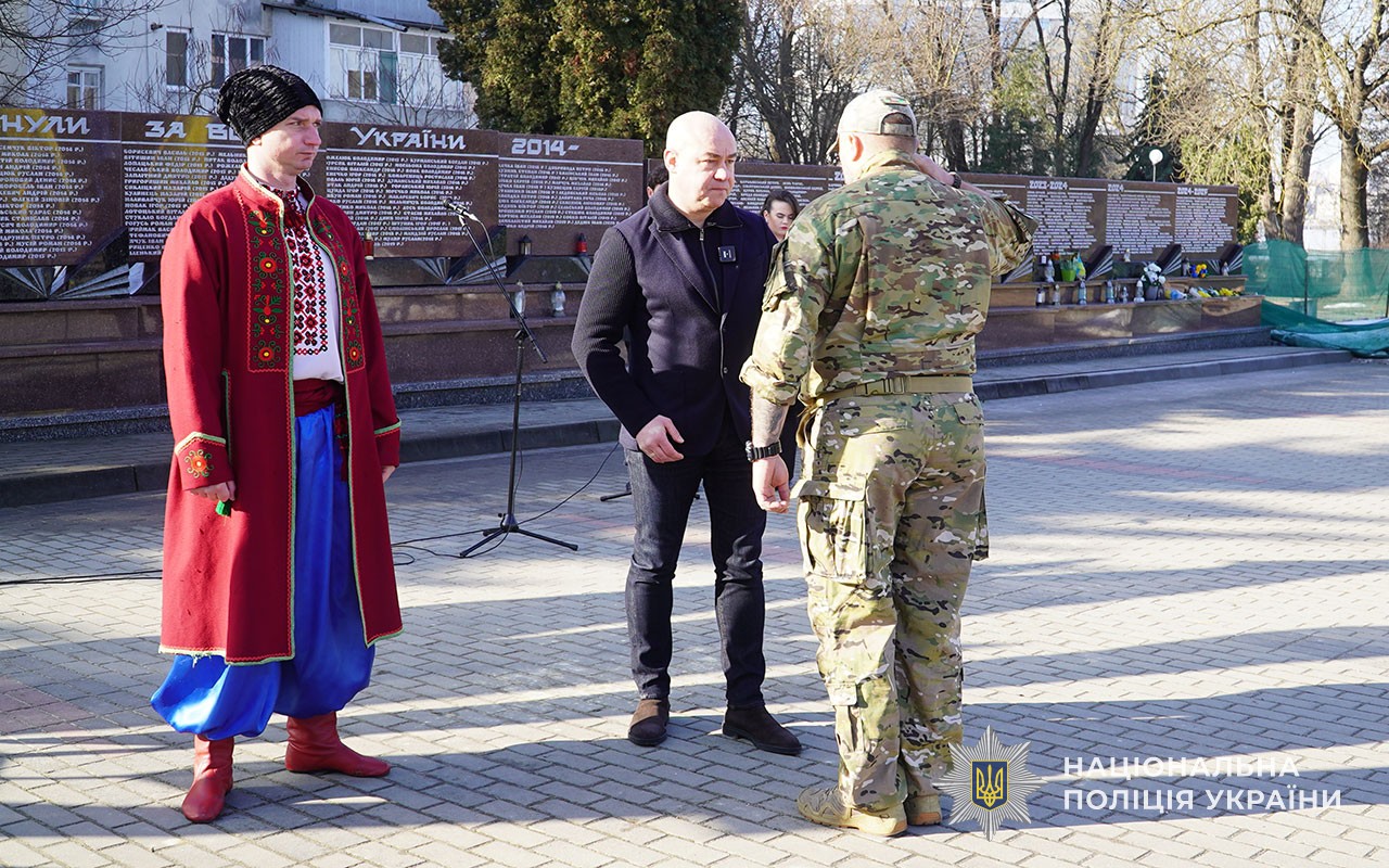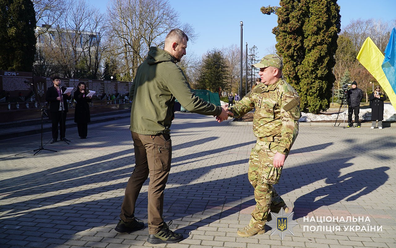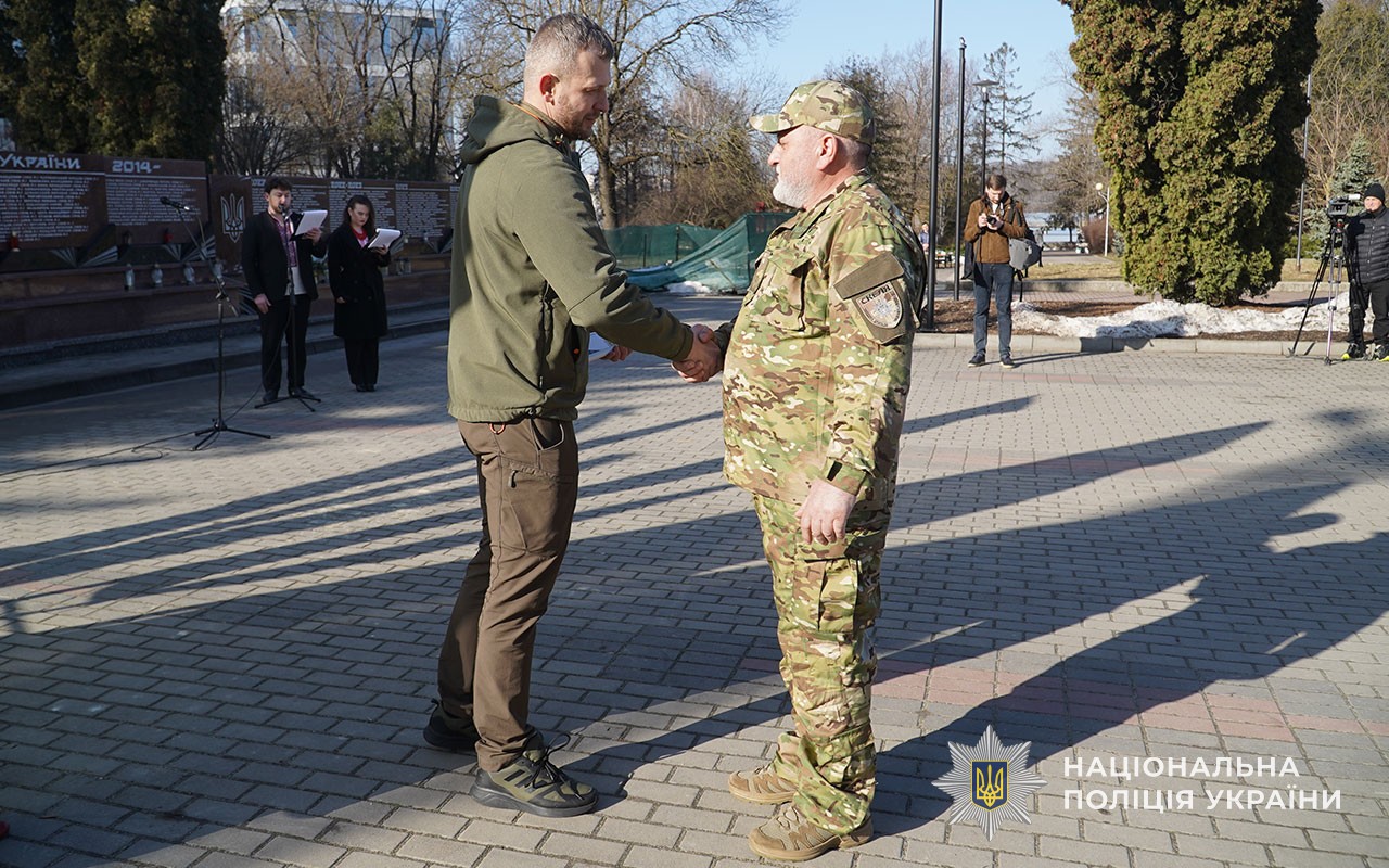 Серед присутніх – представники поліції – саме вони стали основою добровольчих батальйонів, що з 2014 року брали активну участь у антитерористичній операції а згодом - в операції об’єднаних сил. Сьогодні добровольці-поліцейські у складі стрілецьких батальйонів та інших формувань боронять країну на фронті.