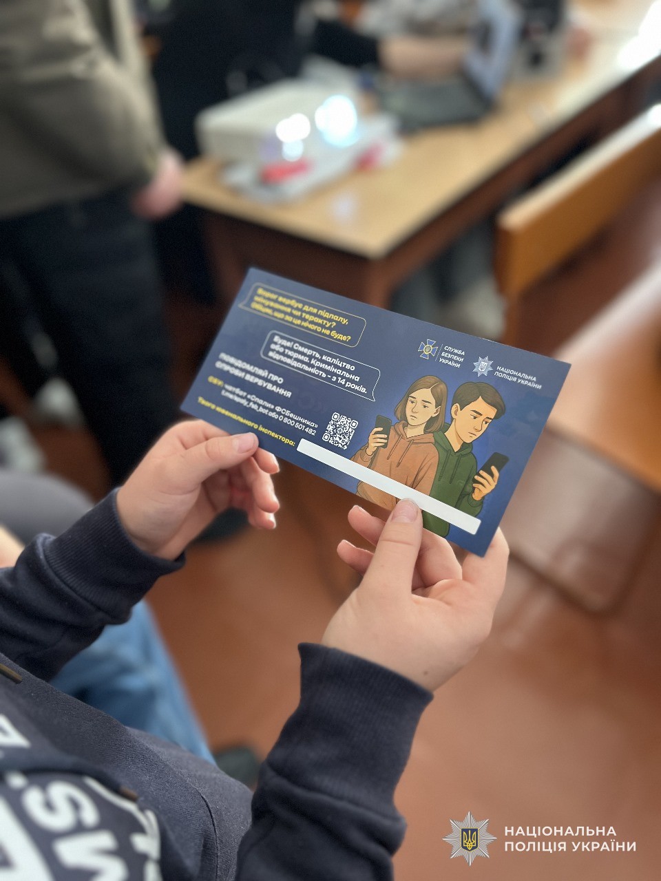 Фахівці розповіли школярам про механізми, які використовує країна-агресор для залучення неповнолітніх до протиправної діяльності — через соціальні мережі, онлайн-ігри, анонімні чати та месенджери. Під час спілкування особливу увагу приділили тому, як відрізнити спроби маніпуляцій, психологічного тиску, уникати провокацій з боку невідомих осіб. Також під час заходу учні отримали практичні рекомендації щодо безпечної поведінки в інтернеті.