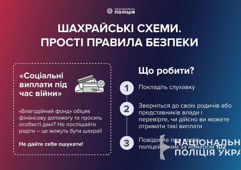 Ця ситуація не зупинила її від подальших необдуманих дій. Днями її знову ошукали шахраї, і цього разу вона втратила майже 41 тисячу гривень. У месенджері жінка побачила повідомлення про те, що держава виплачує громадянам під час війни грошову допомогу. Вона перейшла за посиланням, вказаним у сповіщенні, та ввела дані своєї банківської картки, намагаючись отримати кошти. Після чого з її картки зникло майже 25 тисяч гривень. Пізніше до неї зателефонував шахрай, який представився працівником банку, і повідомив, що з її ще однієї картки невідомі намагаються зняти гроші. Співрозмовник порадив їй перекинути гроші на резервний рахунок. Жінка виконала усі умови співрозмовника та власноруч перерахувала 15 тисяч гривень зі своєї картки на інший рахунок.
