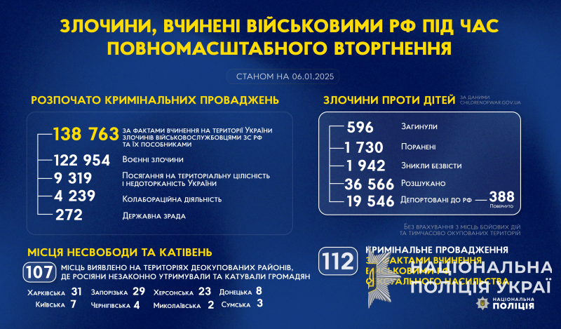 З початку повномасштабного вторгнення росії в Україну слідчі Національної поліції України розпочали 138 763 кримінальних проваджень за фактами вчинення на території України злочинів військовослужбовцями збройних сил російської федерації та їхніми пособниками.