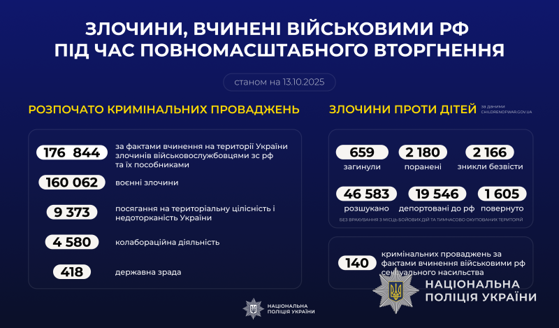 З початку повномасштабного вторгнення росії в Україну слідчі Національної поліції України розпочали 176 844 кримінальне провадження за фактами вчинення на території України злочинів військовослужбовцями збройних сил російської федерації та їхніми пособниками.