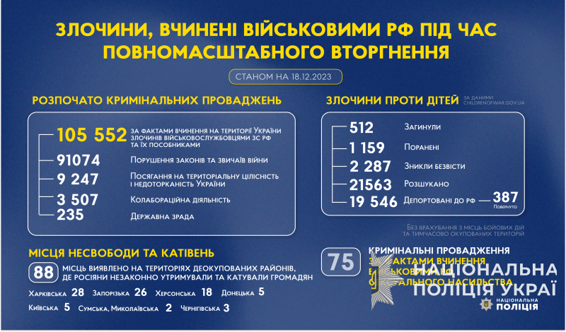 З початку повномасштабного вторгнення росії в Україну слідчі Національної поліції України розпочали 104 897 кримінальних проваджень за фактами вчинення на території України злочинів військовослужбовцями збройних сил російської федерації та їхніми пособниками.