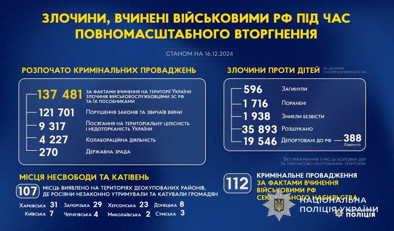 Злочини, вчинені військовими рф під час повномасштабного вторгнення в Україну (станом на 16.12.2024)