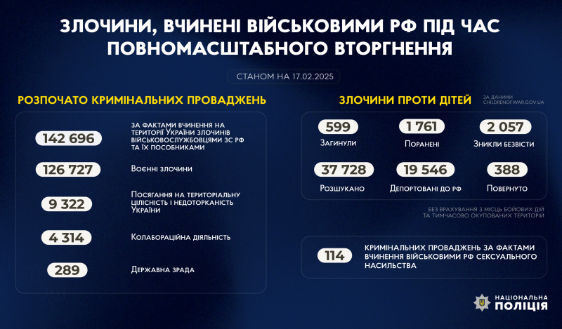 З початку повномасштабного вторгнення росії в Україну слідчі Національної поліції України розпочали 142 696 кримінальних проваджень за фактами вчинення на території України злочинів військовослужбовцями збройних сил російської федерації та їхніми пособниками.