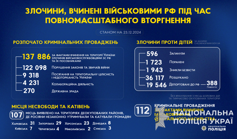 З початку повномасштабного вторгнення росії в Україну слідчі Національної поліції України розпочали 137 886 кримінальних проваджень за фактами вчинення на території України злочинів військовослужбовцями збройних сил російської федерації та їхніми пособниками.