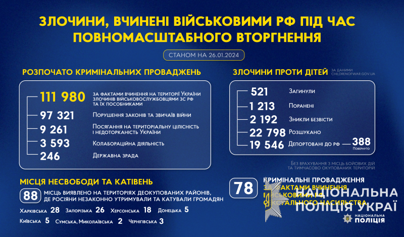 З початку повномасштабного вторгнення росії в Україну слідчі Національної поліції України розпочали 111 980 кримінальних проваджень за фактами вчинення на території України злочинів військовослужбовцями збройних сил російської федерації та їхніми пособниками.