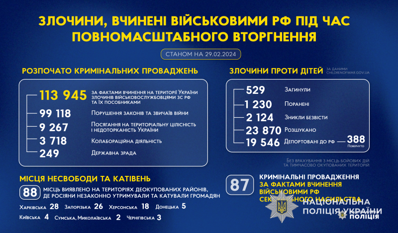 З початку повномасштабного вторгнення росії в Україну слідчі Національної поліції України розпочали 113 945 кримінальних проваджень за фактами вчинення на території України злочинів військовослужбовцями збройних сил російської федерації та їхніми пособниками.