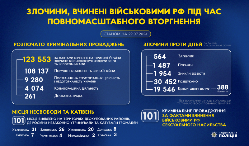 З початку повномасштабного вторгнення росії в Україну слідчі Національної поліції України розпочали 123 553 кримінальних проваджень за фактами вчинення на території України злочинів військовослужбовцями збройних сил російської федерації та їхніми пособниками.
