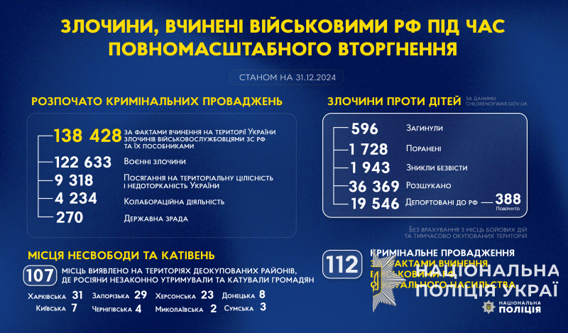 З початку повномасштабного вторгнення росії в Україну слідчі Національної поліції України розпочали 138 428 кримінальних проваджень за фактами вчинення на території України злочинів військовослужбовцями збройних сил російської федерації та їхніми пособниками.